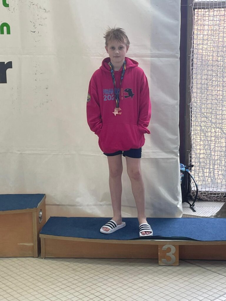 Mayra von Pich-Lipinski (Jg.14) konnte glücklich die Bronze-Medaille über 50m Rücken in 0:37,87min. mitnehmen.