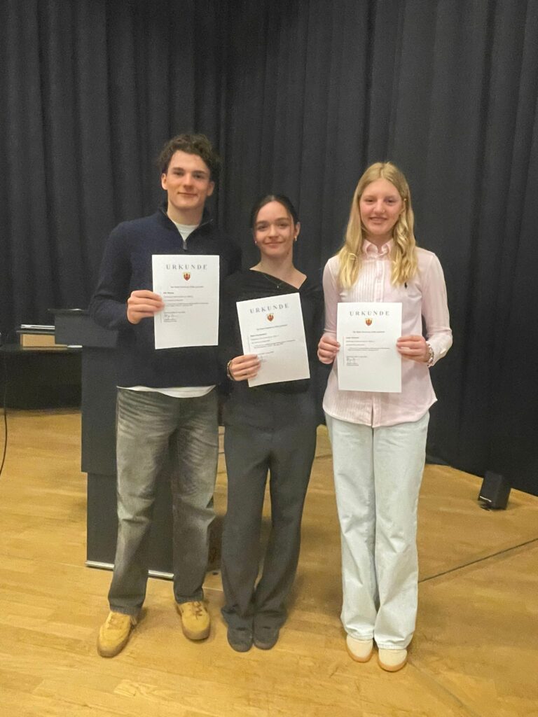 Drei Athleten des OSV durften Glückwünsche, Urkunden und Geschenke von Bürgermeisterin Petra Averbeck und Holger Denkmann (Dezernat für Schule, Sport, Kultur und Gebäudewirtschaft) entgegennehmen- Clara Hennemann (Jahrgang 2008) wurde für den 1. Platz 50S der Landesmeisterschaften und Ole Weerts (Jahrgang 2009) für den 1. Platz 200L der Landesmeisterschaften geehrt. Luise Demmer (Jahrgang 2014) erhielt die Auszeichnung für den 1. Platz in 200S bei den Landesjahrgangsmeisterschaften.